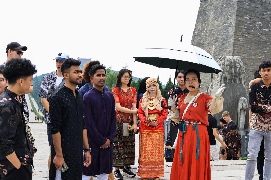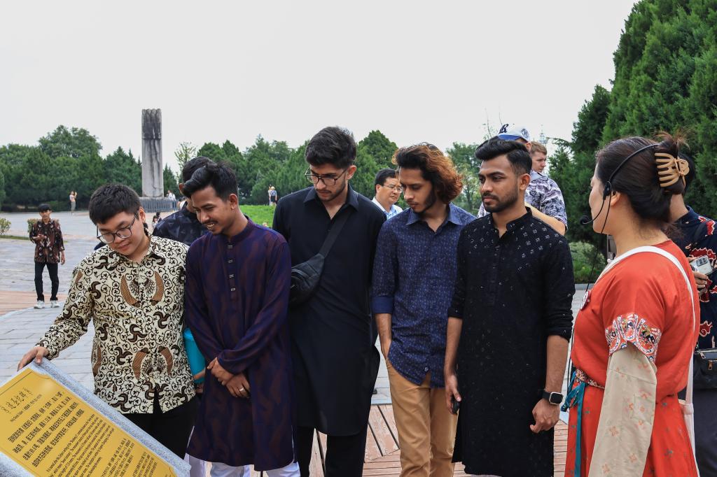 在参观过程中,留学生们认真聆听导游的讲解,不时提出问题,积极与导游互动。他们对乾陵的历史背景、建筑风格以及文化内涵表现出了浓厚的兴趣。一位来自孟加拉国的留学生浩天表示:“乾陵真的太壮观了!我以前只在书本上了解过中国的历史,这次实地参观让我对中国文化有了更深刻的认识。”