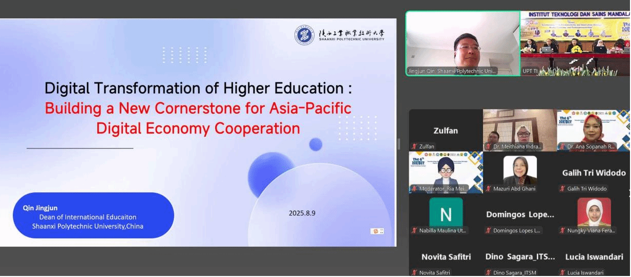 8月9日,由印度尼西亚曼达拉理工学院(ITSM)主办的第六届经济、商业与信息技术国际会议(ICEBIT 2025)以线上线下混合模式顺利召开。本次会议以“通过数字经济和科技创业加速全球连接与创新”为主题,汇聚了中国、美国、马来西亚、东帝汶等多个国家的学界与业界代表,共同探讨数字时代全球经济与技术创新的前沿议题。我校国际教育学院院长秦景俊受邀作为中国代表,在主旨演讲环节分享中国高等教育数字化转型经验,为亚太数字经济合作贡献“陕工智慧”。