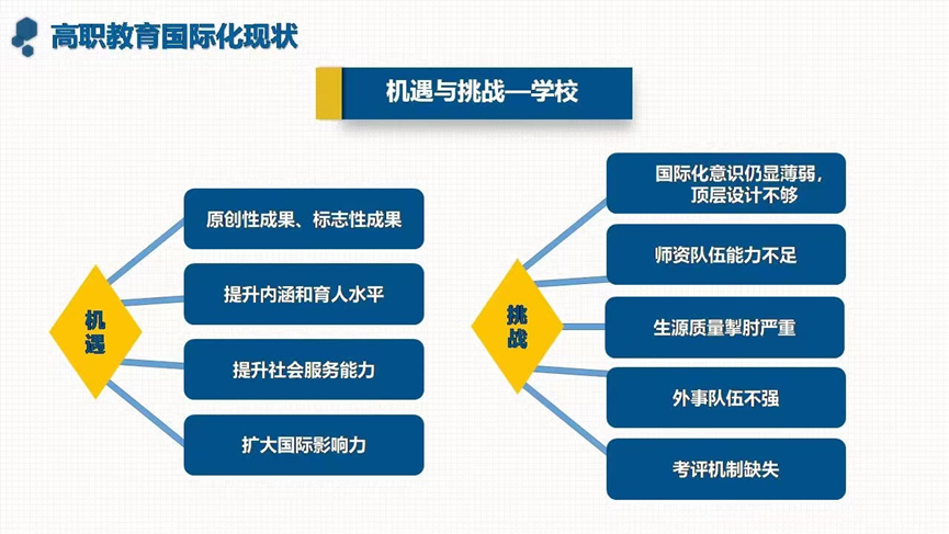 在体会与思考部分,讲座认为,在新冠肺炎疫情期间和职业教育高质量发展背景下,国际交流合作要坚持模式、机制、路径创新,要坚持职业教育类型定位,围绕产教融合,促进国际化重心下移和国际化师资队伍建设。