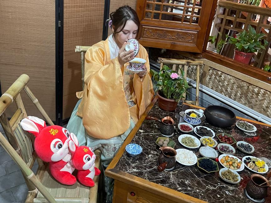 在大家品茶的过程中,罗琳老师向留学生们介绍了汉服的历史发展和演变过程,生动讲解和呈现汉服着装礼仪的规范和要点。罗琳老师向大家介绍到:“作为中华民族文明的标志之一,汉服是维系中华民族物质与精神传承的重要纽带,也是“衣冠上国”、“礼仪之邦”的重要体现。”在互动环节中,印尼留学生唐美和俄罗斯留学生萨莎饶有兴致地穿上了汉服,认真学习了拜礼、平手礼、万福礼等传统礼仪。萨莎兴奋的说:“这次活动穿上美丽的汉服,让我有一种穿越时空、回到古代中国的感觉。喝到好喝的中国茶,并且学到中国传统茶艺文化,我感到非常开心。”
