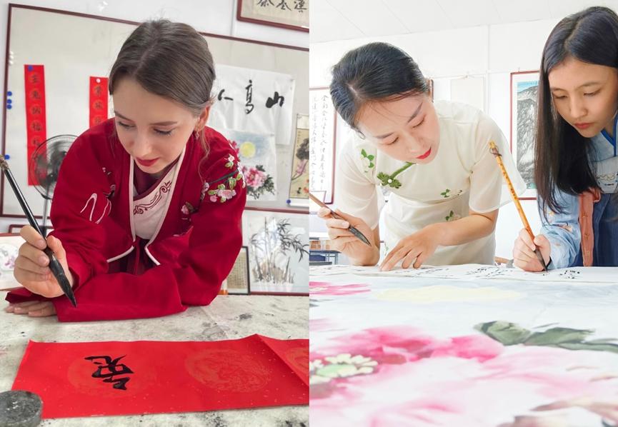 活动的第二部分由王新团老师和刘芳老师简单介绍了中国画的独特之处,并让留学生欣赏了优秀的中国画作品。中国画是具有悠久历史和优良传统的中国民族传统绘画,形式是用毛笔蘸水、墨、彩作画于纸上,技法可分工笔和写意。来自印尼的留学生唐美在王新团老师的指导下,尝试用毛笔画牡丹写意画。在绘画的过程中,留学生们不仅亲身体验了中国传统的书法与绘画文化,也增加了对中国文化的了解。
