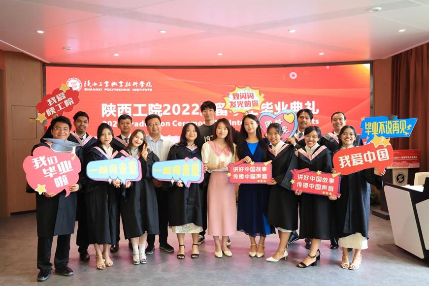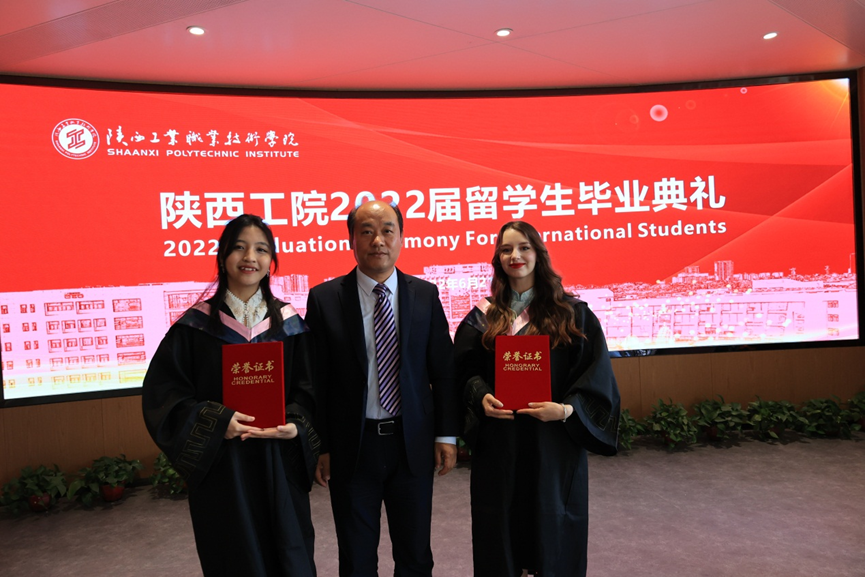 典礼上,校长刘永亮为留学生逐一颁发了毕业证书、纪念品并合影留念。副校长梅创社为优秀毕业生颁发了荣誉证书,为校友联络员颁发了聘书。党委副书记田昊代表学校祝贺各位留学生顺利完成学业,祝福他们梦圆当下、前程锦绣、长乐未央。希望他们在新的征程上,不负过往、不畏将来;接纳变化,迎接挑战;心向卓越,追逐梦想;交流互鉴,乘风破浪。他殷切祈盼同学们承载母校的荣光、铭记师长的嘱托,用青春续写“陕工品牌”的华美篇章。