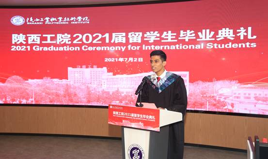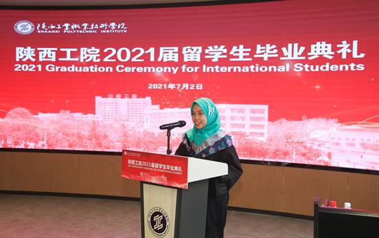 2021届孟加拉留学生孟亮和印尼留学生李美丽作为学生代表先后发言。孟亮在发言中分享了自己三年来的成长与收获,表示这是最充实、最有意义的一段求学时光。李美丽在发言中表示,自己将秉承学校“明德、笃学、精艺、强身”的校训,继续勇敢逐梦,并将工院的名片传递到世界各个角落。