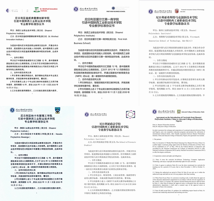 近日,尼日利亚温妮弗雷德创新学院、弗斯特马克创新技术学院、纳卡布斯理工学院、阿德耶米教育学院、爱尔兰第一商学院、尼日利亚政法学校等6所院校分别与我校签署专业和课程引进协议,启动专业和课程合作项目。按照协议,尼日利亚院校共引进我校软件技术等12个专业标准,182门课程标准。协议约定,双方将共同向尼日利亚国家技术教育委员会申请专业认证,推进我校专业标准进入尼日利亚国民教育体系,成为该国专业教学标准。同时,围绕专业和课程合作,双方还将开展尼日利亚教师培训、实训室共建、汉语中心建设、在线课程建设、师生交流等多个合作项目。