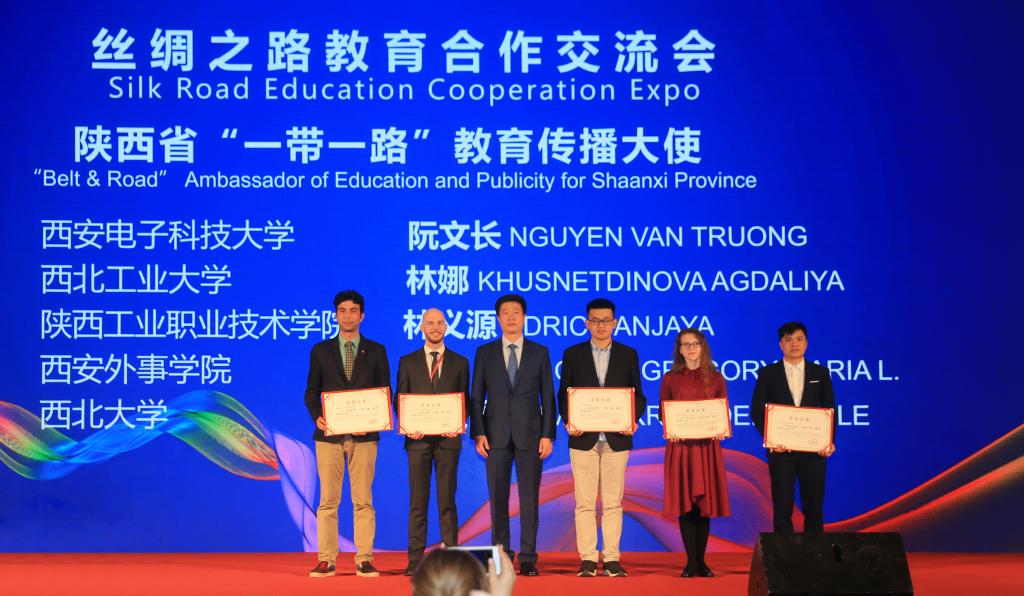 5月11日,由陕西省教育厅主办的“丝绸之路教育合作交流会”于西安举行。我院留学生林义源获得陕西省“一带一路”教育传播大使,教育部国际司副司长李海为林义源同学颁发证书。本次表彰,全省共有14名国际留学生获奖,林义源同学是唯一来自高职院校的外国留学生。