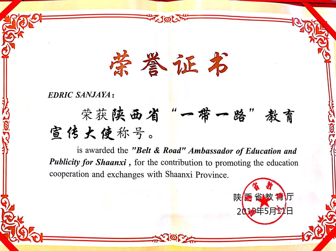 Edric Sanjaya,中文姓名林义源,来自印度尼西亚,陕西工业职业技术学院2018级旅游管理专业留学生。该生担任我校2018级留学生班班长,学习成绩优异,亲华友华,曾获得我校2018/2019学年留学生“二等优秀奖”。该生熟练掌握汉语、印尼语、英语等三国语言,能够积极参加我校对外文化交流活动,多次义务担任翻译。同时,林义源同学还通过微信等社交媒体,积极向印尼的同学们推荐我国的职业教育,并主动介绍我校的校园学习环境和优良的办学成绩,积极推进印尼学生选择陕西、选择陕西工院留学。