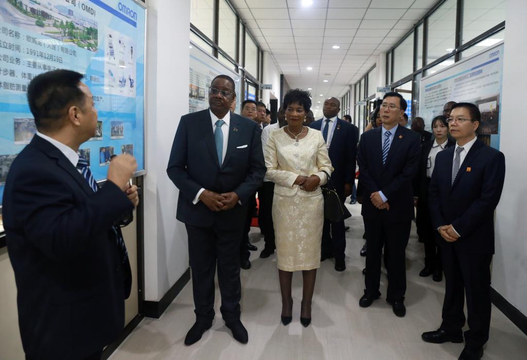 党委书记惠朝阳对阿瑟·彼得·穆塔里卡总统一行的到访表示热烈欢迎,并陪同总统阁下一行参观了我院汽车工程与服务技术训练中心、机加工技术训练中心、欧姆龙自动化技术实训中心等实训场所。每到一处,穆塔里卡总统都饶有兴致地听取讲解、观看演示,不时与现场的教师、学生进行互动,询问相关细节,并对我院的办学成就给予高度肯定。