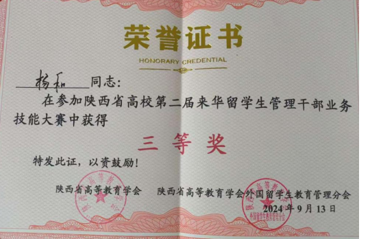 国际教育学院荣膺陕西教育系统外事(港澳台)工作先进集体。李可老师凭借突出的专业素养和敬业精神荣获先进个人称号,杨和老师在陕西省高校第二届来华留学生管理干部业务技能大赛中表现优异,荣获三等奖,并斩获咸阳市引智“先锋”奖。这些荣誉的取得,充分彰显了学校外事工作团队的卓越能力与专业水平。